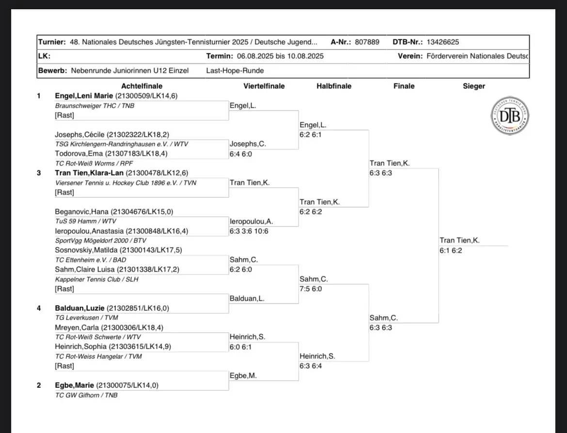 Detmold/Kappeln – Für die elfjährige Claire Sahm vom Kappelner Tennisclub ging es vom 04. - 10.08.2025 in Detmold eine der aufregendsten Wochen ihrer jungen Karriere zu Ende. Bei den Deutschen Meisterschaften der Nachwuchsspielerinnen stand sie nach fünf intensiven Turniertagen auf dem Podest – als Zweitplatzierte der sogenannten „Last Hope“-Runde.